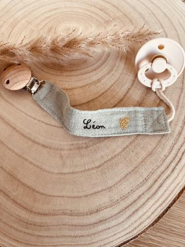 Matière : 100% gaze de coton, douce, légère et respirante Couleur : vert sauge Personnalisation : Prénom en noir + petit cœur doré (réalisée en France, avec soin et amour) Clip : Bois naturel, diamètre 35 mm, solide et sécurisé Entretien : Nettoyage à la main conseillé, ne pas immerger le clip.