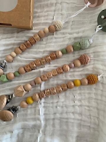 C'est l'un des accessoires préféré de nos bébés ! Reconnaissable grâce aux jolies perles en bois, plus question de la perdre ou de la confondre avec un autre enfant. L'attache tétine se compose de perles en bois, en coton et en silicone, sans BPA.
