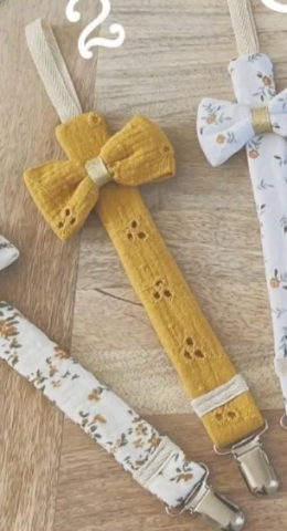 La tétine s’attache à l’aide d’un ruban et vous avez une pince crocodile pour la fixer sur le vêtement, le doudou ect.