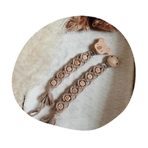 On craque pour cette ravissante attache tétine faite a la main super tendance et pratique, elle permettra a bébé de ne pas perdre sa tétine. Pour la rendre unique, nous vous proposons de la personnalisé avec le prénom de l'enfant. Un petit cadeau unique et original !Matière: Bois naturel et macramé bio.
