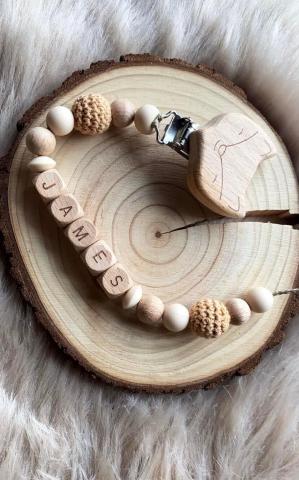 Attache tétine « modèle James » Coloris beige et bois. Toutes nos perles sont totalement adaptées à la dentition de bébé et résistantes à la salive. Clip au choix Le délai actuel de confection est de 2 semaines