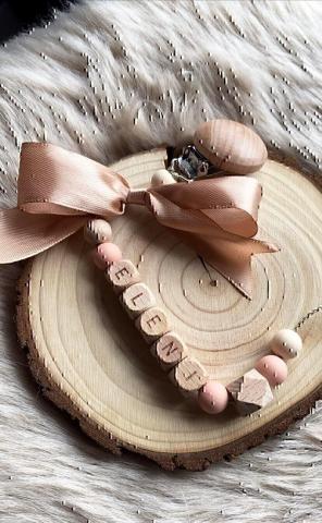 Attache tétine « modèle Eleni » Coloris vieux rose beige et bois. Toutes nos perles sont totalement adaptées à la dentition de bébé et résistantes à la salive.