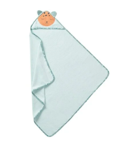 Cape de bain Petit à petit en éponge vert d'eau bordée de l'imprimé jungle du thème. Capuche intégrée pour mettre la tête de bébé avec la petite tête de félin léopard qui donne un côté très ludique. Parfait accessoire pour sécher bébé et le mettre bien au chaud après le bain.