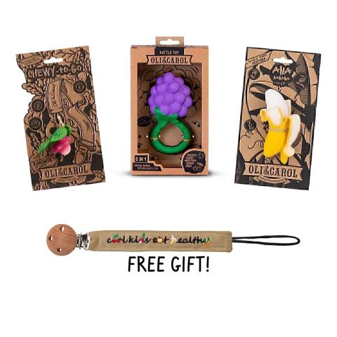 Offrez à votre bébé de 3 mois ce coffret cadeau ! Ce coffret cadeau pour bébé de 3 mois comprend le hochet Raisin, parfait pour secouer et explorer les textures. De plus, il comprend le mini-anneau de dentition radis Ramonita et l'anneau de dentition banane Ana, qui soulagent les gencives tout en s'amusant. Un clip pou