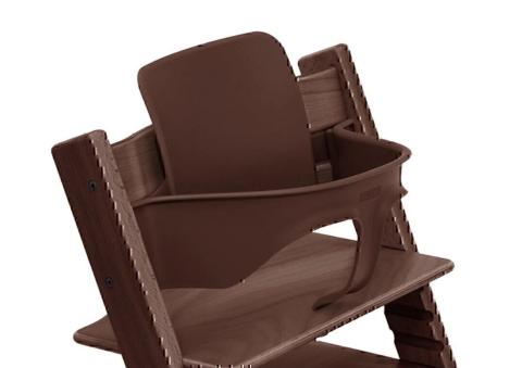 Le siège bébé qui s’adapte à la chaise haute en couleur brun foncé.