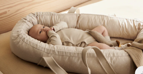NID D'ANGE PORTABLE L'union ultime d'un babylift et d'un nid d’ange réalisé avec des poignées pour être transporté facilement. Le rembourrage, le matelas et la planche de bois sont amovibles, ce qui rend la housse lavable. Compositionr: 100% coton biologique Housse amovible et lavable Parfait pour les lits, sur le cana