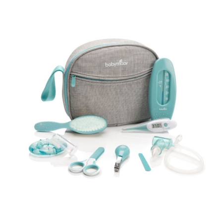 La jolie trousse de soin Babymoov vous accompagnera partout lors de vos déplacements. Grâce à ses 9 accessoires, plus besoin de vous inquiétez d'avoir oublié quelque chose, vous aurez tout à portée de main ! Pratique et facile à transporter avec sa anse et ses nombreuses poches et élastiques.  Composition de la trousse de soin Babymoov : Thermomètre digital avec embout souple Paire de ciseaux avec bout arrondi Coupe ongle et lime Mouche bébé par aspiration buccale (réservoir anti retour des sécrétions), fournie avec un embout Brosse douce Anneau de dentition réfrigérable Thermomètre de bain