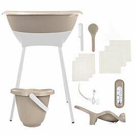 De bad- en verzorgingsset van het merk Luma. Deze set bestaat uit een babybadje, badstandaard, luieremmer, badinzet, kapset, badthermometer, afvoerslang en een 6-delige hydrofiele starterset.