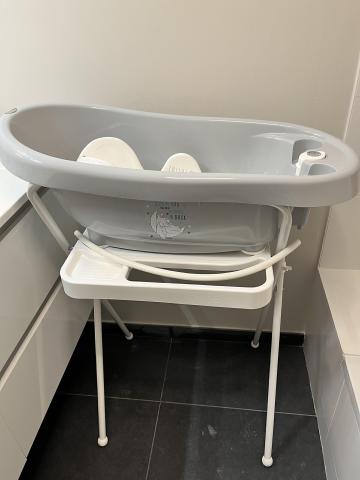 Baignoire sur structure métallique, avec tuyau d’évacuation, thermomètre intégré et siège de bain. Achetée au magasin de deuxième main « Petit Kiwi » à Eghezée.