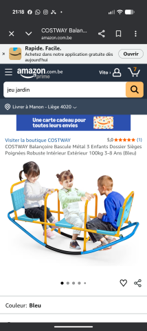 Ce produit est extrait d'une liste de cadeaux (Anniversaire, Noël, ...) déposée sur Kadolog. Kadolog permet de créer des listes de cadeaux (Anniversaire, Noël, ...) en toute liberté. Il est possible d'ajouter toutes vos envies cadeaux et de recevoir les dons directement sur votre compte. Avec les dons reçus, vous êtes alors libre d'aller acheter vos produits (comme ce 'Balancelle pour les enfants ') où et quand vous le souhaitez.