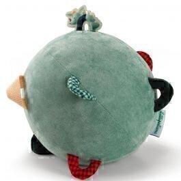 Cette balle sensorielle en tissu de couleur verte de Lilliputiens , sur laquelle trône Joe le Dragon, dispose de poignées aux diverses matières afin de stimuler la motricité fine.