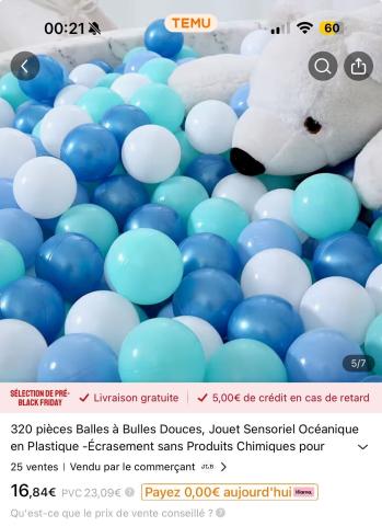 Ce produit est extrait d'une liste de cadeaux (Anniversaire, Noël, ...) déposée sur Kadolog. Kadolog permet de créer des listes de cadeaux (Anniversaire, Noël, ...) en toute liberté. Il est possible d'ajouter toutes vos envies cadeaux et de recevoir les dons directement sur votre compte. Avec les dons reçus, vous êtes alors libre d'aller acheter vos produits (comme ce 'Balles à bulles ') où et quand vous le souhaitez.
