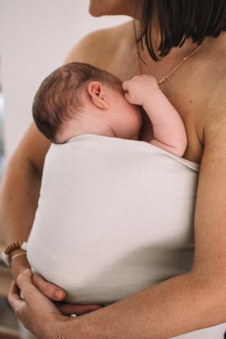 Découvrir le bandeau NÉO gris lin pour profiter dès la maternité des bienfaits du peau à peau pour vous et votre enfant.