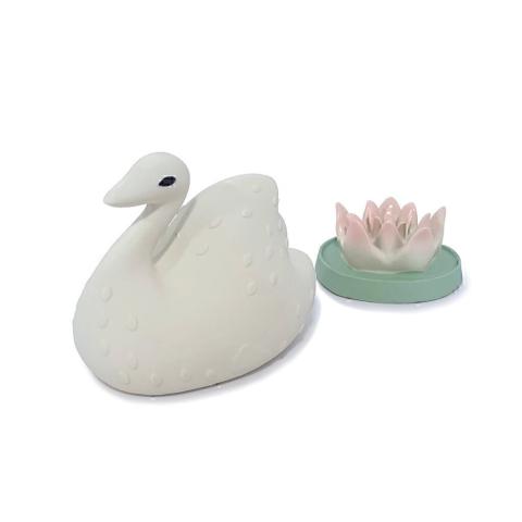 Cutest set of two bath toys shaped as a beautiful swan with embossed feather texture and a delicate waterlily. The different shapes and textures make the Bath Toys appealing for tiny hands and stimulate the child’s visual and tactile senses. The pairing of the two related elements helps the child imagine the swan and t
