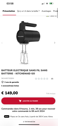 Ce produit est extrait d'une liste de mariage déposée sur Kadolog. Kadolog permet de créer des listes de mariage en toute liberté. Il est possible d'ajouter toutes vos envies cadeaux et de recevoir les dons directement sur votre compte. Avec les dons reçus, vous êtes alors libre d'aller acheter vos produits (comme ce 'BATTEUR ELECTRIQUE SANS FIL SANS BATTERIE - KITCHENAID GO | KitchenAid BE ') où et quand vous le souhaitez.