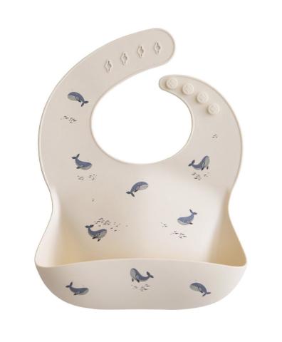 Adoptez le bavoir en silicone - Whales de la marque mushie. Idéal pour que votre petit ne tache pas ses jolies vêtements. Un indispensable du quotidien pour des repas propre et avec style....