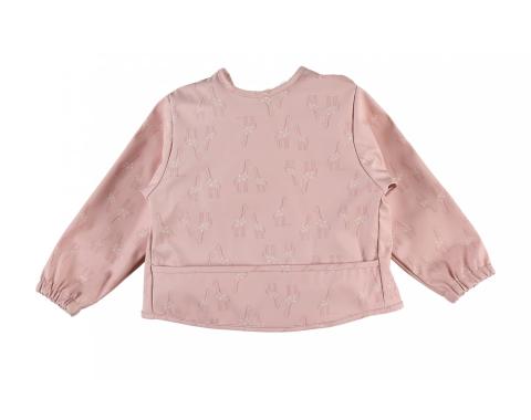 Un joli tablier à manches pour bébé artiste (6M-2 ans) rose en toile cirée déperlante imprimé girafes! Pour manger et s’amuser tout en ne salissant pas ses vêtements.