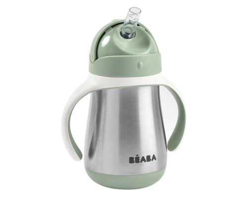 BÉABA, Biberon/Tasse d'apprentissage/Gourde Bébé 2 en 1 Inox, Tasse Paille Enfant, 100% étanche, Anti-fuite, Facile à Ouvrir, Poignées amovibles, Matière Inox, Sain, Solide, 250 ml, Vert sauge