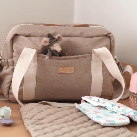 BÉABA, Sac à Langer pour Bébé, Multiples Compartiments, 10 poches, Glissière trolley-valises, Bandoulière, Pochette isotherme, Matelas à Langer, Déperlant, Contenance 16L, Sac Paris, Terre d'argile
