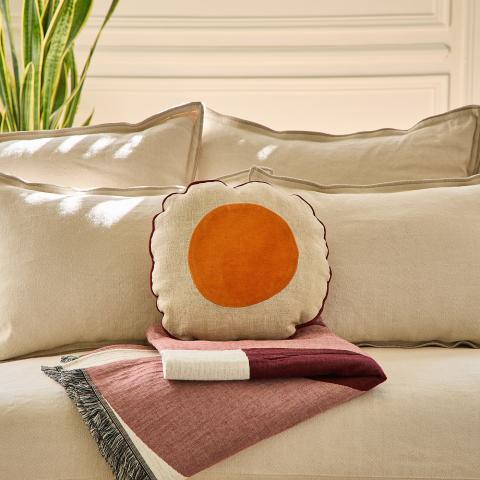 Berenice est un coussin rond en lin et coton de 40 cm imaginé par Floriane Jacques et décliné en beige et orange pour un intérieur sophistiqué et coloré.
