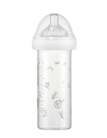 Vous allez craquer pour ce biberon en verre ! Le design gypsophile vous rappellera la douceur de votre nouveau-né. Système anti-coliques breveté.