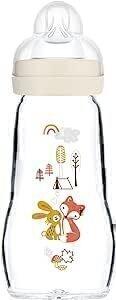 MAM Feel Good Biberon en verre (260 ml), bouteille de lait avec large ouverture, gourde solide pour bébé avec tétine taille 1, dès la naissance, lapin/renard