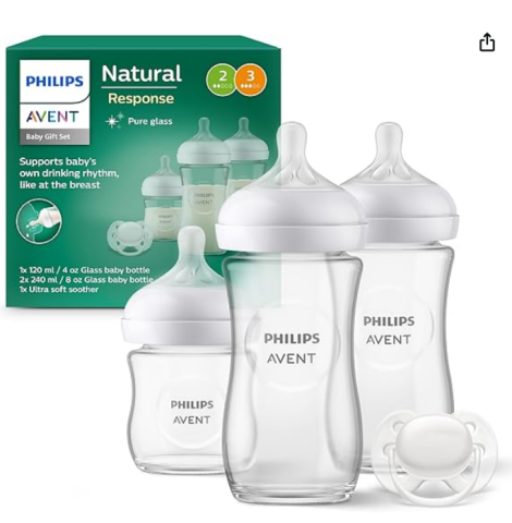 Philips Avent Kit biberons en verre pour nouveau-né – 3 biberons à Réponse Naturelle, sucette ultra-douce 0 à 6 mois, sans BPA (modèle SCD878/11)