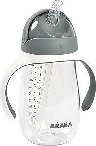 Béaba Biberon/Tasse d'apprentissage 2 en 1, Tasse Paille Enfant, 100% étanche, Anti-fuite, Facile à Ouvrir, Poignées amovibles, Tritan et Silicone, 300 ml, Gris Minéral