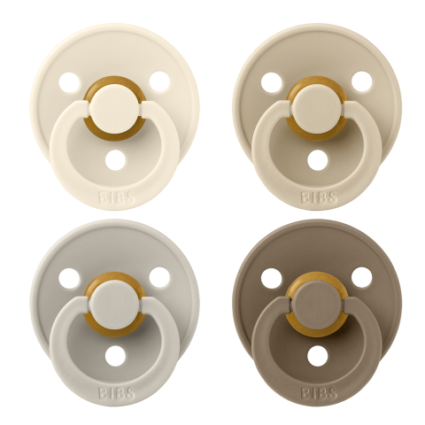 Original BIBS pacifiers available in natural latex with three nipple shapes. Made in Denmark with food-grade material. Sizes 1 and 2 for babies 0+ and 6+ months.