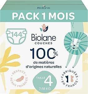 BIOLANE - Couches Taille 4 - (7-18 kg) - Peaux Sensibles - Ultra-Absorbant, Pas de Fuite, 12h au Sec - Pack 1 mois 144 couches - Fabriqué en France