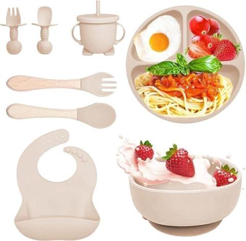 Bizcasa Lot de 8 gruau pour enfant, en silicone, sans BPA, pour bébé, avec ventouse, assiette, bol, tasse de bavoir (beige)