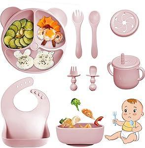 Bizcasa Lot de 9 gruau pour enfant, en silicone, sans BPA, pour bébé, avec ventouse, assiette, bol, tasse de bavoir (rose clair) : Amazon.com.be: Bébé et Puériculture