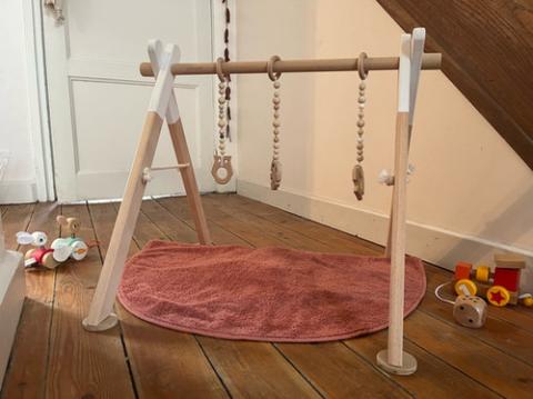 **PREMIER JEU POUR BÉBÉ** Au cours de son premier mois, bébé commencera à s’intéresser au monde qui l’entoure. L’arche d’éveil est idéale pour favoriser ses premières découvertes et son développement.De plus, la position allongée pour bébé est la plus favorable pour l’aider à se muscler. Rien de mieux que d’observer des heures notre nouveau né en train de faire sa petite gymnastique tout en observant les jolis mobiles suspendus.**DES SUSPENSIONS ADAPTÉES**MaPetiteTribu vous propose 3 suspensions à attacher pour amuser bébé qu’a adoré notre petite fille Céleste lorsqu’elle était bébé et qu'apprécie notre fille Olympe actuellement. L’arche peut aussi servir de portique pour les mobiles Montessori. L’idéal est de proposer à bébé de multiples jeux pour varier, couleurs, formes, matières, et contrastes en fonction de son âge.Toutes les commandes sont préparées à la demande, vous pouvez donc choisir les couleurs de perles, et animaux, formes (présents sur les photos). Sans demande précise de votre part, l'atelier composera un assortiment neutre.**FRANÇAIS ET MATERIAUX BIEN CHOISIS**MaPetiteTribu conçoit ses produits dans les Hauts de France, à Bondues, dans notre atelier familial et choisit ses matériaux avec soin. #FIERTÉ.**LA SÉCURITÉ AVANT TOUT**Bébé pourra s’amuser en toute sécurité sous cette arche, et vous permettra de relâcher un peu la pression tout en le regardant s’éveiller à ses côtés. Les jouets étant fixés à l’arche, il ne pourra les ingérer, et risquer l’étouffement.Nous vous conseillons d’installer bébé confortablement sur un petit tapis bien matelassé, ou un tapis à langer afin qu’il ne soit pas directement sur le sol dur plusieurs heures. Bébé doit avant tout être bien pour se développer à son rythme, et toujours accompagné. L'arche est également conçue pour se poser au dessus d'un transat.**ELLE EST CARRÉMENT STYLÉE**MaPetiteTribu souhaite avant tout proposer des produits qui font partie de notre quotidien, qui décorent nos maisons où vit toute la famille. Son design bois vous permettra de l’installer dans la chambre de bébé, dans le salon, n’importe où. Elle passera inaperçue dans votre déco. Le petit plus est la couleur pour les plus créatifs. Elle est spéciale bébé, naturelle, sans solvant toxique pour bébé.**CARACTÉRISTIQUES**Matériaux :L’arche est en hêtre naturel non traité FSC, la ficelle en coton, les perles en bois et silicone spéciales dentition bébé.La peinture est sans solvant pour éviter toute allergie. Dimensions :Hauteur de la barre : 46 cm Espacement entre les pieds : 46 cmProfondeur : 40 cmCouleurs disponibles :Blanc, Rose poudré, Bleu Marine, Noir, Vert d’eau, Jaune moutarde, Gris souris et Bois brut sans peinture.A très bientôt, et nous restons disponibles pour toutes les questions :-)Antoine et Flore, jeunes parents passionnés et créatifs pour nos bébés :-)