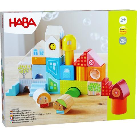 Boîte de 28 blocs en bois de différentes formes et joliment décorés pour s'amuser à recréer une petite ville de la marque allemande HaBa