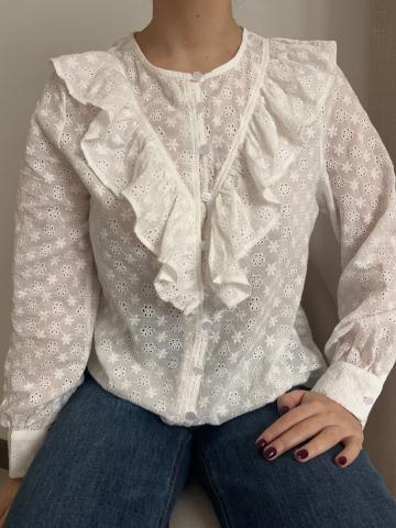 Blouse avec broderie anglaise Volants sur le devant Taille S/M ou M/L Prenez votre taille habituelle Porter avec sous vêtements de couleur chair Avec boutons