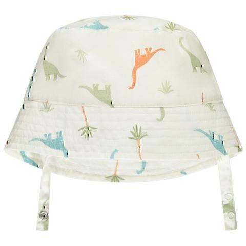 Bob en popeline. Coloris écru. Imprimé fantaisie dinosaures/palmiers all-over. Surpiqûres ton sur ton à la base. Liens à pressionner sous le menton. Doublure en voile.