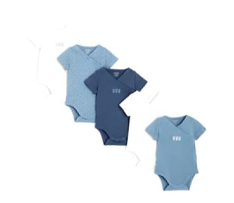 Doux sur la peau des petits, un lot de bodies manches courtes en jersey de coton. 3 unis et 2 à points. Fermeture pressionnée croisée pour habiller le nouveau-né sans trop de manipulations.