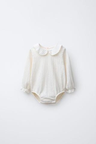 Body avec col Claudine et manches longues finies par élastique. Fermeture goutte d'eau avec bouton dans le dos et à pression sur le bas.