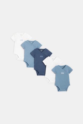 Doux sur la peau des petits, un lot de bodies manches courtes en jersey de coton. 3 unis et 2 à points. Fermeture pressionnée croisée pour habiller le nouveau-né sans trop de manipulations.