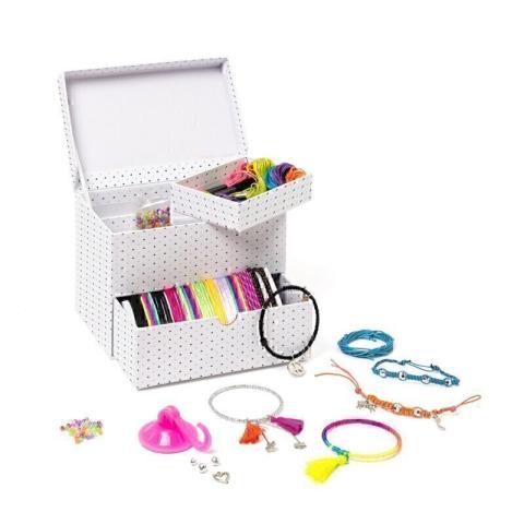 Cette grande boîte à bijoux et perles est le kit parfait pour fabriquer des bracelets à l'infini ! Perles en tout genre, pompons, breloques, cordons et autres gems offrent à votre enfant le choix pour développer sa créativité et la précision de ses gestes. Un mode d'emploi avec quatre exemples de modèles le guide dans ses premières réalisations. Ensuite, à lui de se lancer dans des bracelets dont lui seul aura le secret ! Le petit plus ? Un accessoire à ventouse lui permet de maintenir le bracelet stable pendant sa création !