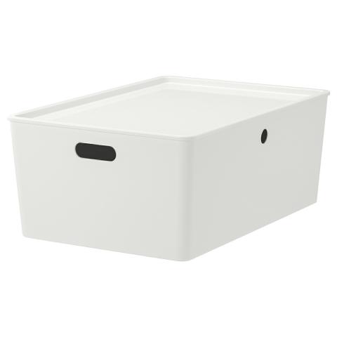 KUGGIS boîte avec couvercle, blanc, 37x54x21 cm Cette boîte brillante est assez spacieuse pour ranger de grands équipements de jeux ou des fournitures diverses. Le couvercle protège le contenu de la poussière et permet aussi d'empiler facilement plusieurs boîtes.