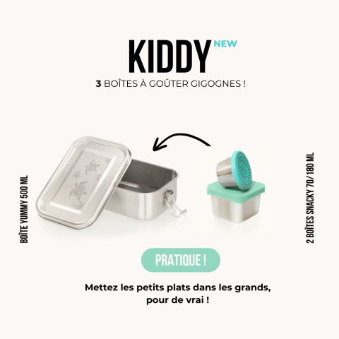 Boîte à goûter enfants modulable 800ml. Sans plastique et légère, elle est garantie sans fuite et sans odeur ! Tout inox, saine et facile à ouvrir/fermer.