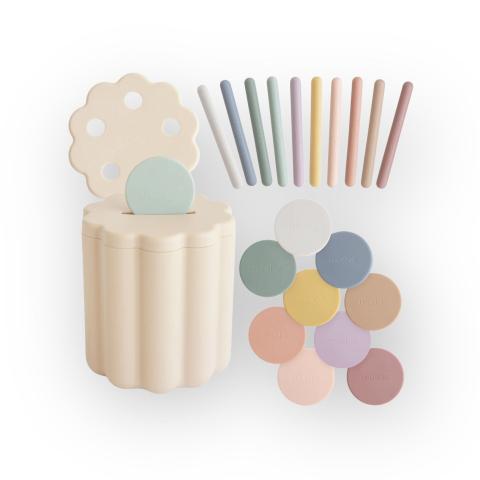 Votre mini découvre de nouvelle compétences avec cette boîte fine. Conçue avec des bords ondulés, la boîte est livrée avec deux couvercles interchangeables et 20 pièces colorées (pièces et tubes). Votre mini va s’amuser à insérer chaque élément dans la bonne fente – parfait pour développer la motricité fine et la coord