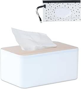 Boîte à mouchoirs et lingettes humides, boîte à mouchoirs, distributeur, rechargeable, en plastique, avec couvercle en bois, pour salle de bain, chambre à coucher, bureau, cuisine (blanc).