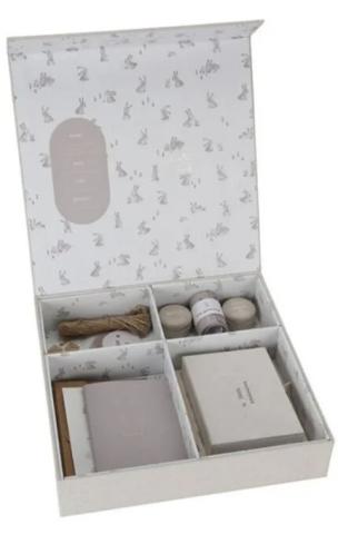 Avec des petits lapins, une belle boîte pour garder tous les premiers souvenirs (premiers vêtements, premiers mots, premières dents…)