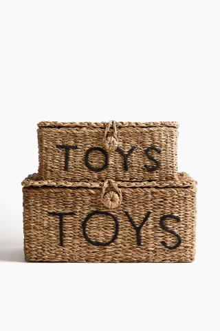 Boîtes de rangement en jonc de mer tressé pour les jouets et autres petits articles. Modèle avec texte brodé devant et un couvercle à soulever muni d’un œillet et d’un bouton.
