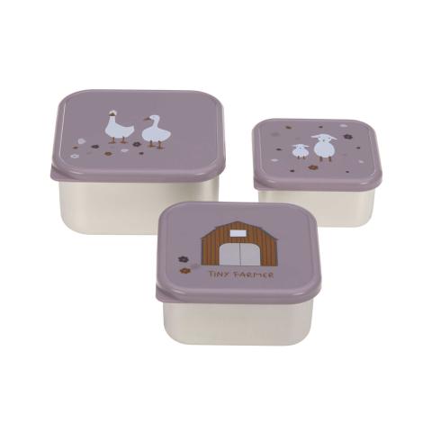 Les boîtes à goûter en inox, carrées, avec leurs jolis Tiny Farmer motifs en lilas, sont sans BPA, passent au lave-vaisselle et grâce à leurs différentes tailles s’empilent facilement les unes dans les autres pour gagner de la place.