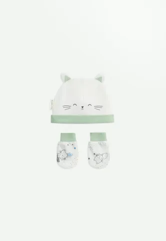Le lot de bonnet et moufles sert à protéger bébé des petites griffures. On craque pour la petite bouille de chat et les petites pattes.