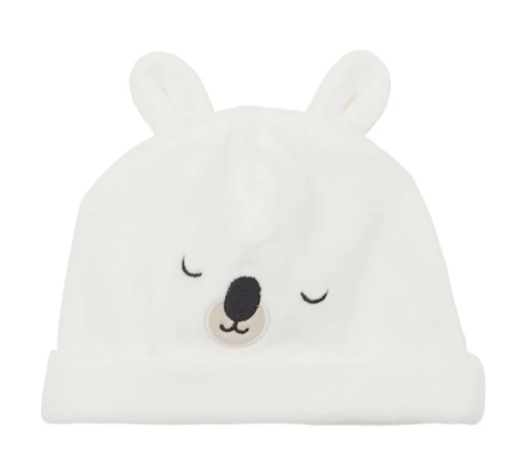 Bonnet naissance Marèse en coton bio à revers en velours écru. Deux petites oreilles de koala top mignonnes. Une pièce à la fois fonctionnelle et absolument craquante avec la petite tête d'un koala qui dort brodé sur le devant.