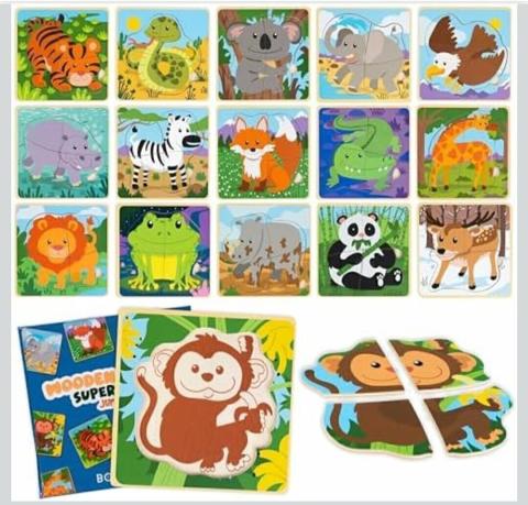 PACK AVEC 16 PUZZLES EN BOIS - Chaque puzzle enfant de 14,5 x 14,5 x 0,5 cm pour les enfants à partir de 10 mois contient 4 pièces, un sachet opaque scellé et un design animalier différent